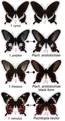 In P. protenor, both males and females are non-mimetic and monomorphic. There was no inversion of the chromosomal segment containing the doublesex gene. The inversion of the dsx gene and the mimicry limited to females is common in five species of butterflies now.